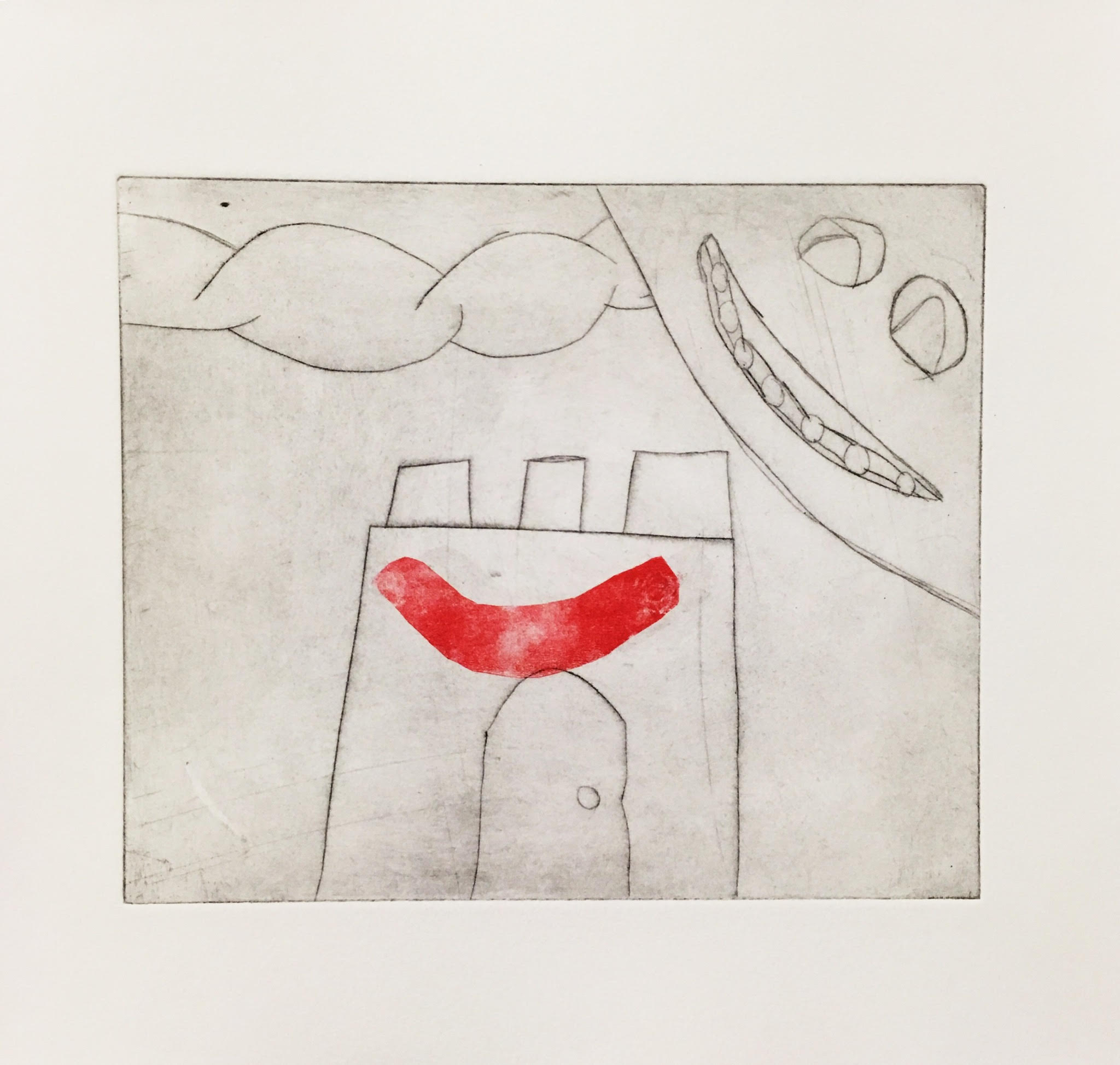 A black and white child's drawing of a castle with a red stripe in the shape of a smile beneath the crenellations.